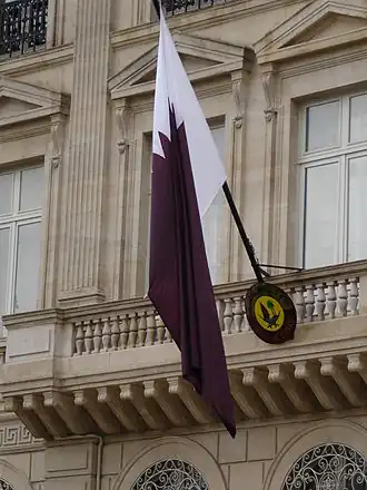 De linkerbalk is wit, hetgeen symbool is voor vrede. De rechterbalk is paarsbruin, als een verwijzing naar de werking van de zon op het pigment in de huid van mensen en als symbool van het bloed dat in het verleden voor Qatar is vergoten.