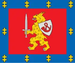 Het regionale embleem in het midden van de vlag is een rood veld staat een gouden lynx met zilveren wapens (tanden, tong en klauwen), die een zilveren zwaard in zijn rechter voorpoot houdt, en de linker is bedekt met hetzelfde schild, waarop een rode jachthoorn met riem zit.