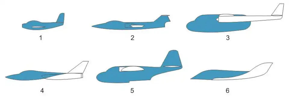 Op een vliegtuig zitten de piloten in een cockpit aan de voorkant van de romp. Passagiers en vracht worden achter in de romp vervoerd en de brandstof wordt meestal in de vleugels opgeslagen. Voor een gevechtsvliegtuig bevindt de cockpit zich normaal gesproken bovenop de romp, worden wapens op de vleugels gedragen en worden de motoren en brandstof aan de achterkant van de romp geplaatst.