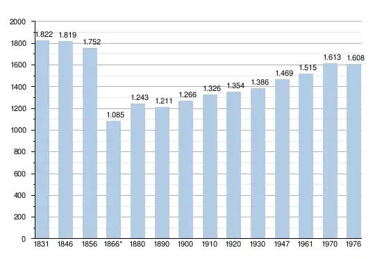 - Bronnen:NIS, Opm:1831 tot en met 1970=volkstellingen; 1976 = inwoneraantal op 31 december