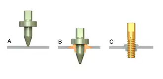 - Dit proces is niet mogelijk in 'vol' materiaal. Het vervloeide materiaal moet ergens heen kunnen. De maximale materiaaldikte is ongeveer de helft van de diameter van het te vormen gat. Het is mogelijk om materiaal tot 12 mm dik op deze wijze te bewerken.