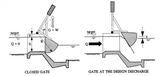 De stuw bestaat uit een drijvende trommel die functioneert als een schuif en als tegengewicht, zie figuur. De voorkant van de trommel is verticaal, maar de trommel heeft een semi-cirkelvormig achtervlak. Het midden van de cirkel van het achtervlak is hetzelfde als de rotatieas van de stuw zodat de hydraulische stuwkracht van het stroomafwaartse waterniveau door de as stroomt en niet leidt tot een moment op de trommel. Het contragewicht bevindt zich boven de trommel om een moment te bieden tijdens de lagere debieten, en om geen moment te veroorzaken bij de hogere debieten om het drukverlies over de stuw te verminderen. De locatie van de contragewicht W is ook bepaald door de hoek , zie ook figuur. De modeltests van de vlugterstuw zijn gebaseerd op de hoek . De bepaling van de grootte van het contragewicht is identiek aan dat van de begemannstuw, maar het exacte gewicht moet in het veld worden bepaald totdat de stuw opent en correct wordt gesloten.