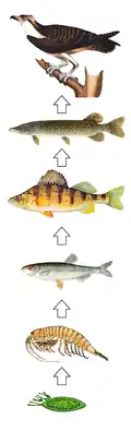 De afgebeelde voedselketen werkt als volgt: groene algen vermenigvuldigen zich met fotosynthese, waarbij ze - uit water en koolstofdioxide - koolhydraten maken voor hun energiebehoefte, en eiwitten die dienen als bouwstoffen voor hun cellen. Kreeftjes eten vervolgens de algen, forellen eten kreeftjes, baarzen eten forellen, snoeken eten baarzen, visarenden eten snoeken. In dit voorbeeld is een algensoort de producent, de basis van de voedselketen. Alle daaropvolgende trofische niveaus worden bezet door consumenten. De kreeftjes zijn de primaire (eerste) consument in de keten, ze zijn herbivoor; ieder volgend trofisch niveau wordt ingenomen door een carnivore (vleesetende) consument of predator.