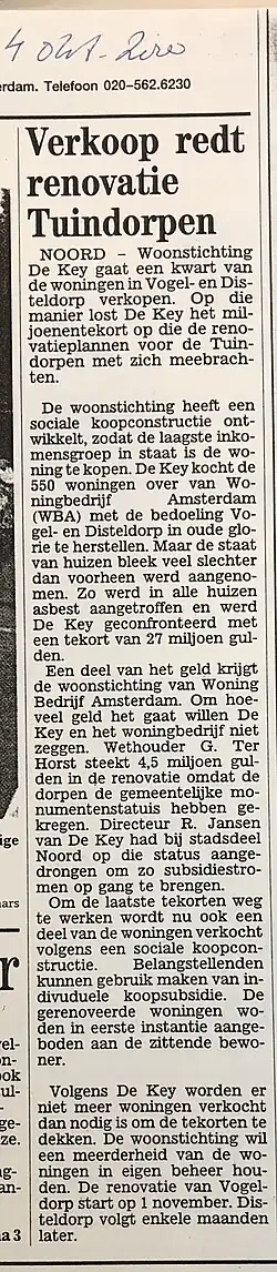 - ↑ Marietta Haffner en Marja Elsinga, Dorpspolitiek. Samenwerking renovatie Disteldorp, Tuindorp Oostzaan en Vogeldorp p. 40. Habiforum (september 2006). Geraadpleegd op 16 september 2018. “Uit stukken van De Key (ook uit interviews) blijkt dat het renovatieproces niet altijd even soepel is verlopen. Er bleken vertragingen te ontstaan onder andere vanwege personeelsgebrek bij de onderaannemer(s). Ook bij De Key trad capaciteitsgebrek op bij de projectorganisatie en bij de afdeling verantwoordelijk voor het bedrijfsonroerend goed. Verder werd de bouwroute door de dorpen niet als efficiënt ervaren. Ook liepen de contacten niet naar wens, mede omdat er besluiten werden genomen die niet altijd werden teruggekoppeld. Naast het aanpassen van de werkafspraken, is er in de zomer van 2001 een nieuwe planning gemaakt die door alle actoren is geaccepteerd.”