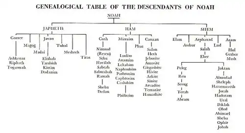In de Nieuwe Bijbelvertaling luidt de lijst van nakomelingen van Noachs zonen in Genesis 10 als volgt: