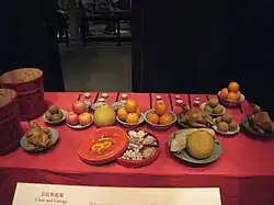 Er worden voor de voorouders bij dit ritueel ook wierook, dodengeld, papieren dodenspullen, fruit en andere voedsel geofferd. De papieren waren worden voor het familiegraf verbrand en de andere offermaterialen worden voor de voorouderborden en het familiegraf geplaatst.