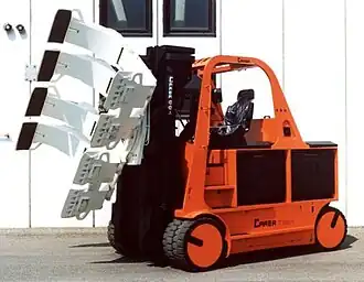 Later volgden vernieuwingen zoals voorwielaandrijving, elektromotoren, enz. Er werden allerlei typen ontwikkeld, zoals de stapelaar, reachtruck, heftruck met meervoudige vorken, smallegangtruck, zijlader, verreiker en de meeneemheftruck, die men ook wel kooiaap noemt. Ook verschenen er hulpstukken, bijvoorbeeld voorzetstukken om allerlei ladingen te kunnen verplaatsen. Denk hierbij aan stenenklem, vatenklem, rollenklem, dozenklem, schrootgrijper, rondhoutgrijper, tapijtdoorn, sneeuwschuiver, schepbak of een kooi voor het veilig heffen van mensen met bediening van de hefmast vanuit de kooi. Ook is er de mogelijkheid om de heftruck te voorzien van een vorkenbord met vorkversteller. Met de vorkversteller kun je de breedte van de vork hydraulisch regelen. Deze is te verkrijgen in enkelvoudige uitvoering met twee vorktanden, maar ook in dubbele uitvoering, met vier vorktanden, of zelfs driedubbele uitvoering, met zes vorktanden.