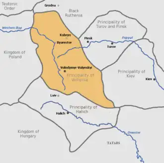 De heerschappij van de vorsten van Wolynië besloeg het hele westelijke deel van het Kievse Rijk tot 1086, met de burchten Volodimer', Volyn, Tsjerven, Peremysjl, Belz, Berestia, Zvenyhorod, Boesk, Loetsk, Drohobytsj, Izjaslav, Kremenets, Sjoemsk, Halytsj, Terebovlja en Peresopnytsja.