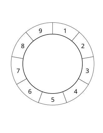 Hiervoor stellen we de 9 posities in de stand voor als de uren op een klok. Met dat verschil dat we dus geen 12 uren maar 9 posities hebben.