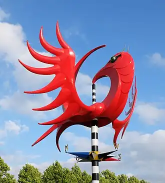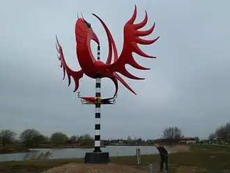 De Vuurvogel is gemaakt van plaatstaal en bestaat uit een vuurrode vogel die met de snavel balanceert op een paal met zwarte en witte banden. De vogel fungeert als windwijzer. Halverwege de paal is een windroos aangebracht. De hoogte van het geheel is 9,5 m, de spanwijdte 10,5 m. Het gewicht is 2250 kg, hetgeen het draaien van de vogel niet belemmert. Cornelis Huisman (1939), de kunstenaar, heeft een werktuigbouwkundige achtergrond.