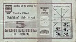 Vanaf eind juli 1932 gaf het gemeentebestuur zijn eigen zogenaamde werkcertificaten uit, de Wörgler Schilling, ter waarde van 34.500 schilling als loon voor gemeentelijk werk dat door werklozen werd verricht. De bankbiljetten waren verkrijgbaar in coupures van 1, 5 en 10 schilling. De rugzijde toont het gezegde “Hij verlicht ontberingen, geeft werk en brood!”. De gemeenschap die het Freigeld uitgaf, kocht echter in totaal slechts 8.500 noodschilling van de commissie, waarvan gemiddeld slechts ongeveer 6.000 schilling in omloop was. Aangenomen wordt dat de werkelijke geldomloop die binnen de veertien maanden plaats vond, ruim 400 maal bedroeg.