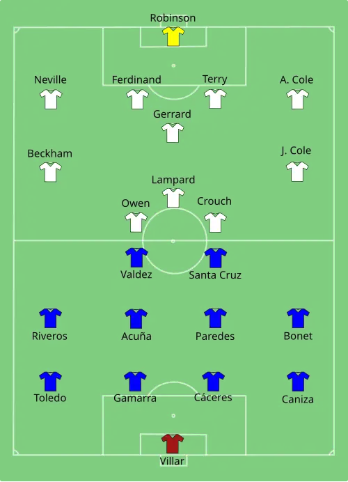 | Paul Robinson Gary Neville Rio Ferdinand John Terry Ashley Cole David Beckham Steven Gerrard Frank Lampard Joe Cole Michael Owen Peter Crouch |