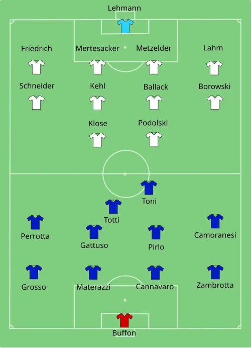 opstellingen | Gianluigi Buffon Fabio Grosso Fabio Cannavaro Gennaro Gattuso Luca Toni ( Francesco Totti Mauro Camoranesi ( Gianluca Zambrotta Simone Perrotta ( Andrea Pirlo Marco Materazzi |