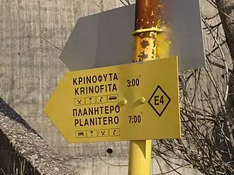 - ↑ Rolf Roost in: "Griechenland E4 Peloponnes", Stein Verlag 2007, ISBN 978-3-86686-221-0. Wijzigigen worden bijgehouden op de site van Stein Verlag