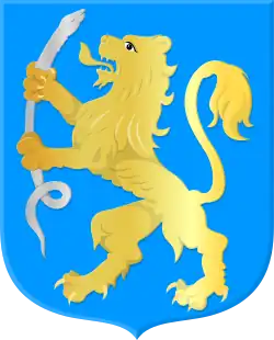 Een veld van lazuur beladen met een klimmende leeuw van keel houdende een aal in deszelfs voorpoten.