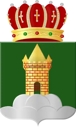 In sinopel een geopende woontoren met puntdak van goud, gemetseld en met valhek van keel, geplaatst op een heuvel met zeven toppen (3 en 4) van zilver. Het schild getopt met een baronnenmuts van de Oostenrijkse Nederlanden.[1]
