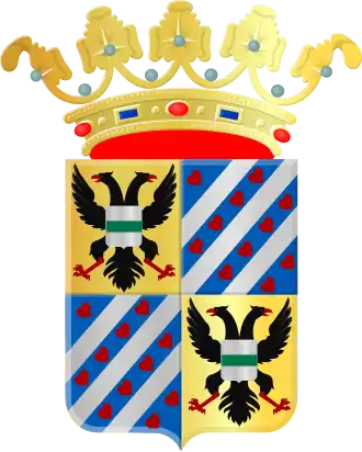 - "Gevierendeeld; I en IV in goud een dubbele adelaar van sabel, dragende op zijn borst een schildje van zilver, beladen met een dwarsbalk van sinopel; II en III in zilver drie linker schuinbalken van azuur, vergezeld van elf schuingeplaatst harten van keel 1, 4, 4, 2. Het schild gedekt met een gouden kroon van vijf bladeren en vier paarlen en ter wederzijde vastgehouden door een leeuw van goud."