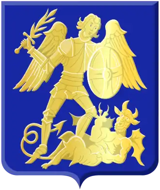 D'azur à un saint Michel ailé brandissant de la dextre une épée flamboyante, de la senestre une rondache, et terrassant le démon, le tout d'or.
