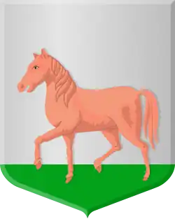 In zilver een dravend bruin paard op een grond van sinopel. .[2]