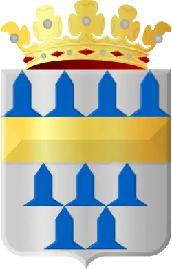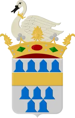 In zilver een verhoogde dwarsbalk van goud, getopt met vier aaneengesloten vairklokjes en vergezeld beneden van vijf aaneengesloten en aanstotende vairklokjes, geplaatst 3 en 2. Het schild getopt met een kroon met drie fleurons gescheiden door drie parels waarvan een verheven van goud, waarin een zwaan van natuurlijke kleur met een kroon van goud om de hals.[1]