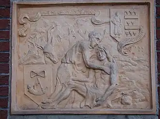 Doorsneden door een dwarsbalk van keel, beladen met een horizontaal geplaatste rozentak van zilver: I Gedeeld: a in azuur een hoorn van goud, beslagen en gesnoerd van keel, waaruit een kinderborstbeeld van natuurlijke kleur komt; b in keel een kogge van goud, varende op een zee, golvend gedwarsbalkt van zilver en azuur van zes stukken; II een krukkenvair van zilver en sabel. Het schild gedekt met een gouden kroon van drie bladeren en twee parels.[1]