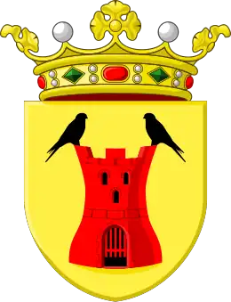 In goud een gekanteelde burcht van keel, op welks hoektinnen 2 toegewende valken van sabel zitten. Het schild gedekt met een gouden kroon van 3 bladeren en 2 paarlen.
