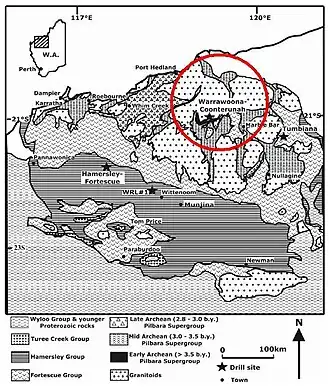 De Warrawoona Group bestaat uit twaalf formaties verdeeld over drie subgroepen. De fossielen komen uit verschillende van die onderverdelingen, maar de bekendste vindplaats is de Apex Chert. Ultramafisch gesteente komt vooral voor in de onderste delen van de groep.
