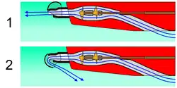 2. stuwstraal achteruit gebogen door omkeerplaat