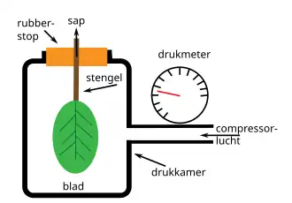 Een drukkamer is een instrument waarmee bij benadering de waterpotentiaal in plantenweefsel gemeten kan worden. Zo wordt bijvoorbeeld een blad dat aan een stengelstuk vastzit in een luchtdichte kamer geplaatst, waarna de kamer langzaam met gas op druk gebracht wordt. De druk die er heerst op het moment dat er sap uit het xyleem van de stengel begint te komen, geeft de waterpotentiaal van het blad aan.[3]