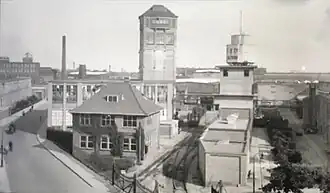 Rechts de watertoren uit 1902, achter het waterzuiveringsgebouw en net niet zichtbaar; links de toren van 1917. -