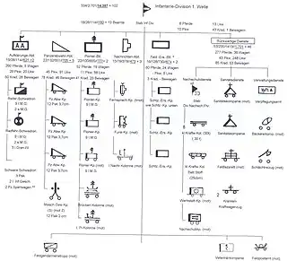 Het was de bedoeling dat de divisies zouden worden bemand door 518 officieren, 102 beambten, 2.573 onderofficieren en 13.667 soldaten, met een totaal van 16.860 man. De uitrusting omvatte 3.681 pistolen, 12.609 geweren, 535 machinegeweren, 26 infanteriekanonnen, 75 antitankkanonnen, 48 artilleriestukken, 530 motorfietsen, 394 auto's, 536 vrachtwagens en 5.375 paarden. Een 1e Welle infanteriedivisie was georganiseerd in drie infanterieregimenten, elk bestaande uit drie bataljons. Elk bataljon bestond uit drie geweercompagnieën met aanvankelijk elk negen lichte en twee zware machinegeweren (later vervangen door elk twaalf lichte machinegeweren en drie lichte granaatwerpers). Elk bataljon bevatte ook een machinegeweercompagnie met acht zware machinegeweren, later opgewaardeerd tot twaalf. Het beschikte ook over een compagnie infanteriekanonnen met twee zware en zes lichte infanteriekanonnen, en een antitankcompagnie met twaalf PaK's.