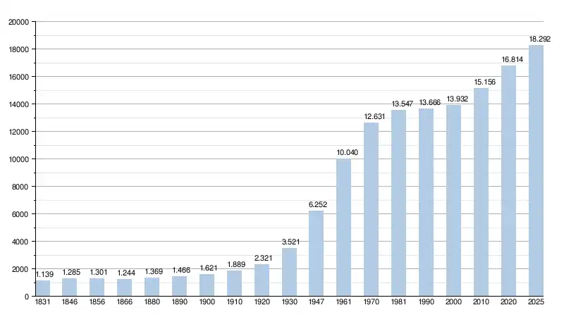 - Bronnen:NIS, Opm:1831 tot en met 1981=volkstellingen; 1990 en later= inwonertal op 1 januari