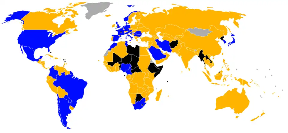 Deelnemende landen (blauw), landen die zich niet kwalificeerden (oranje) en landen die niet aan de kwalificatie deelnamen (zwart)
