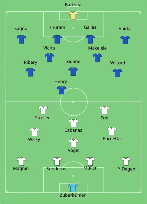 | Fabien Barthez Éric Abidal Patrick Vieira William Gallas Claude Makélélé Zinédine Zidane Sylvain Wiltord Thierry Henry Lilian Thuram Willy Sagnol Franck Ribéry |