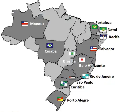 De Braziliaanse voetbalbond (CBF) selecteerde achttien stadions in zeventien staten.[15] Oorspronkelijk wilde de FIFA tussen de acht en tien gaststeden aangewezen zien, maar ging het toch in op een verzoek van de Braziliaanse bond om twaalf gaststeden in twaalf verschillende staten aan te wijzen.[16] Na een uitgebreide analyse samen met het organisatiecomité wees de FIFA in mei 2009 de twaalf gaststeden aan.[17]