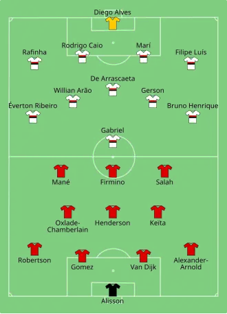 Bijz.: * De scheidsrechter besloot een strafschop toe te kennen aan Liverpool. Na bestudering van de beelden, aangedragen door de video-assistent, werd alsnog geen strafschop toegekend en de gele kaart werd ook ingetrokken.