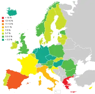 | Portugal | 7,4 | 7,8 | 8,8 | 8,9 | 9,1 | 8,8 | 10,7 | 12,0 | 12,9 | 15,8 | 16,4 | 14,1 |
