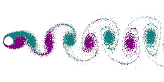 Indien het getal van Reynolds lager is treedt een symmetrische verder zetting van de stroming op. Bij een hogere treedt een onregelmatige werveling op.[2][3]