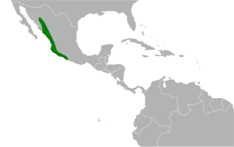 De vogel komt voor in een brede strook langs de westkust van Mexico in verschillende typen tropisch bos, ook in secundair bos.