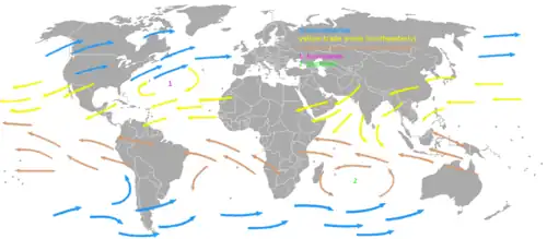 De westenwinden ontstaan door de lagedrukgebieden van de westcirculatie. Deze frontale depressies hebben op het noordelijk halfrond een klimatologisch minimum in het IJslandlaag op de Atlantische Oceaan en het Aleoetenlaag op de Grote Oceaan. Op het zuidelijk halfrond ligt er een circumpolaire gordel van lage druk tussen 40° en 65° breedte.
