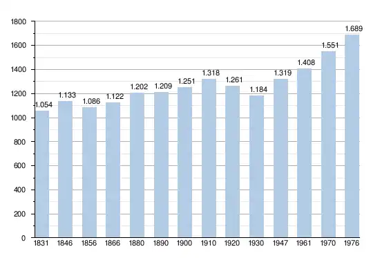 - Bronnen:NIS, Opm:1831 tot en met 1970=volkstellingen; 1976 = inwoneraantal op 31 december