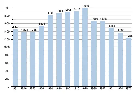 - Bronnen:NIS, Opm:1831 tot en met 1970=volkstellingen; 1976 = inwoneraantal op 31 december