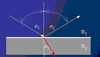 - ↑ Uitgezonderd volledig transparant materiaal en verticaal gepolariseerd licht invallend bij de Brewsterhoek. Niet volledig transparante materialen hebben een complexe brekingsindex. Bij deze materialen is er altijd reflectie, maar volledige interne reflectie treedt niet op.