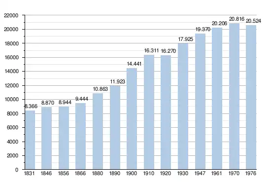 - Bron:NIS - Opm:1831 t/m 1970=volkstellingen op 31 december; 1976= inwonertal per 31 december