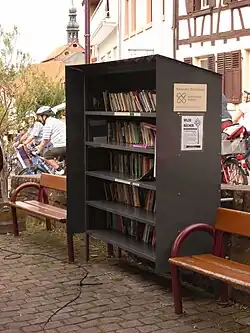 Op de marktplaats tegenover het gemeentehuis staat een openbare boekenkast waar iedereen vrij is om boeken uit te halen en hun oude boeken erin te stoppen.