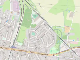 Station Mortsel-Liersesteenweg, met rechts parkeergarages en appartementsgebouwen van de Lieve Gruyaertstraat -
