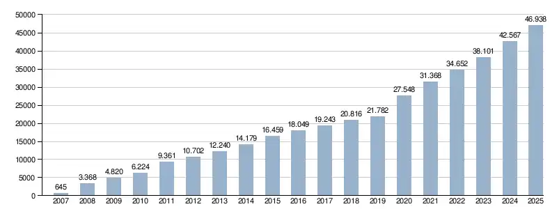 De groei van het aantal artikelen, gebaseerd op de automatische teller op de hoofdpagina van WikiKids, zoals die ieder jaar in het begin van januari is vastgelegd door de Wayback Machine, is hieronder te zien.