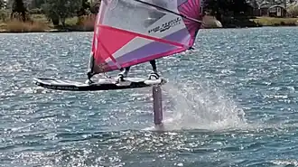 Windfoilen is een watersport die lijkt op het windsurfen, maar met een ander type board of een klassiek board dat sterk genoeg is om een foil in te plaatsen. Op het board zelf plaatst men een zeil dat vastgemaakt wordt met een mastvoet. Windfoilen is niet te verwarren met wingfoilen, waarbij in plaats van een windsurfzeil een wing of vleugel gebruikt wordt om de surfer te liften.[1] Tijdens het foilen komt de windsurfer uit het wateroppervlak omhoog bij het planeren, volgens het principe van een draagvleugelboot. De hoogte varieert tot maximum 90 centimeter. Door het liften van het board, kan de surfer met kleine(re) zeilmaten toch hoge(re) snelheden halen omdat het board minder weerstand ondervindt. Wie windfoilt kan dus kleinere zeilen gebruiken in vergelijking met een gewone windsurfer. Het is doorgaans een sport die vooral beoefend wordt met lichtere wind. Planeren bij windfoilen kan vanaf ongeveer 8 à 10 knopen, terwijl het minimum bij het windsurfen op 12 à 14 knopen ligt.[2]