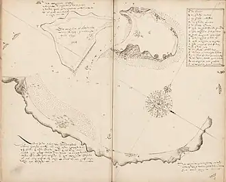 - ↑ In de 17e eeuw, vóór de uitvinding van de chronometer, kon men alleen de breedtegraad bepalen. Voor de lengtebepaling waren zeelieden aangewezen op hun kaarten in combinatie met waarnemingen van bekende kusten, stromingen, windrichtingen en het verschijnen van vogels of drijvende stukken vegetatie, wat de nabijheid van land aankondigde.
