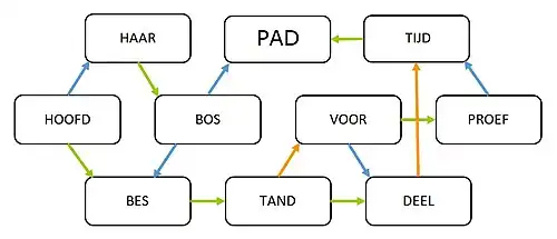 De gevraagde woorden vormen onderling langere woorden of woordcombinaties die in de puzzel door lijntjes met elkaar zijn verbonden. De kleur van de lijnen geeft aan van welk vak naar welk vak een langer woord loopt.